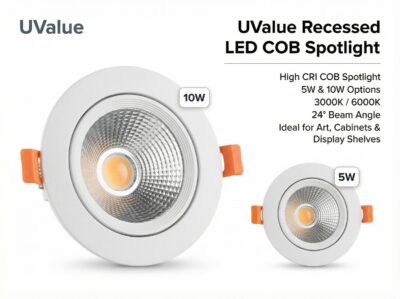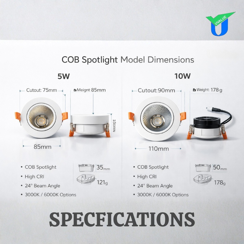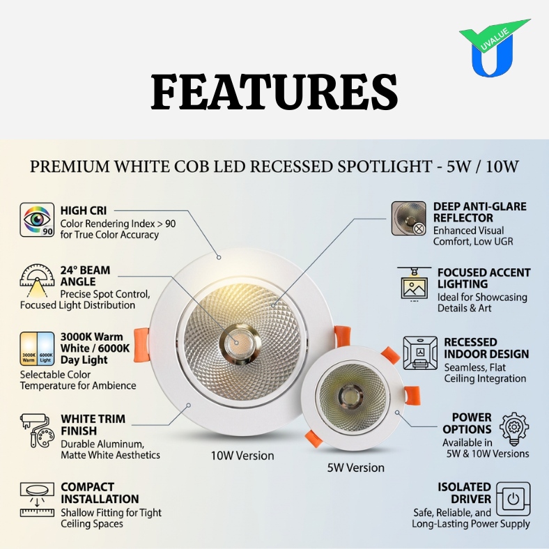 Bring sharper, cleaner accent lighting into your space with this recessed COB spotlight. Built for focused illumination, this model is suitable for highlighting feature walls, artwork, display shelves, cabinets, and boutique-style interiors.