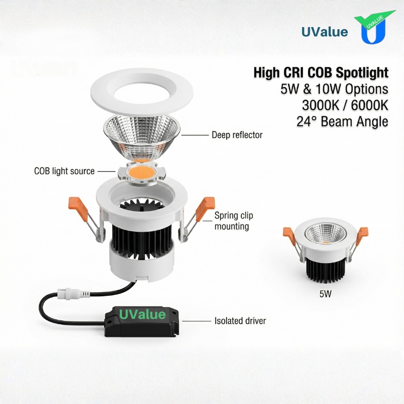 With a 24° focused beam angle, this spotlight gives you tighter light control than a general downlight, making it a stronger choice when you want attention on a specific area instead of flooding the whole room.